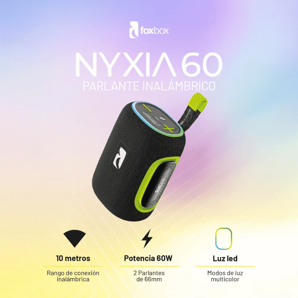 El Nyxia 60 también incorpora función TWS, que permite emparejar dos parlantes para lograr un sonido estéreo más envolvente, y powerbank integrado, ideal para cargar tu celular durante el uso. Todo en un diseño moderno, resistente y fácil de transportar.
